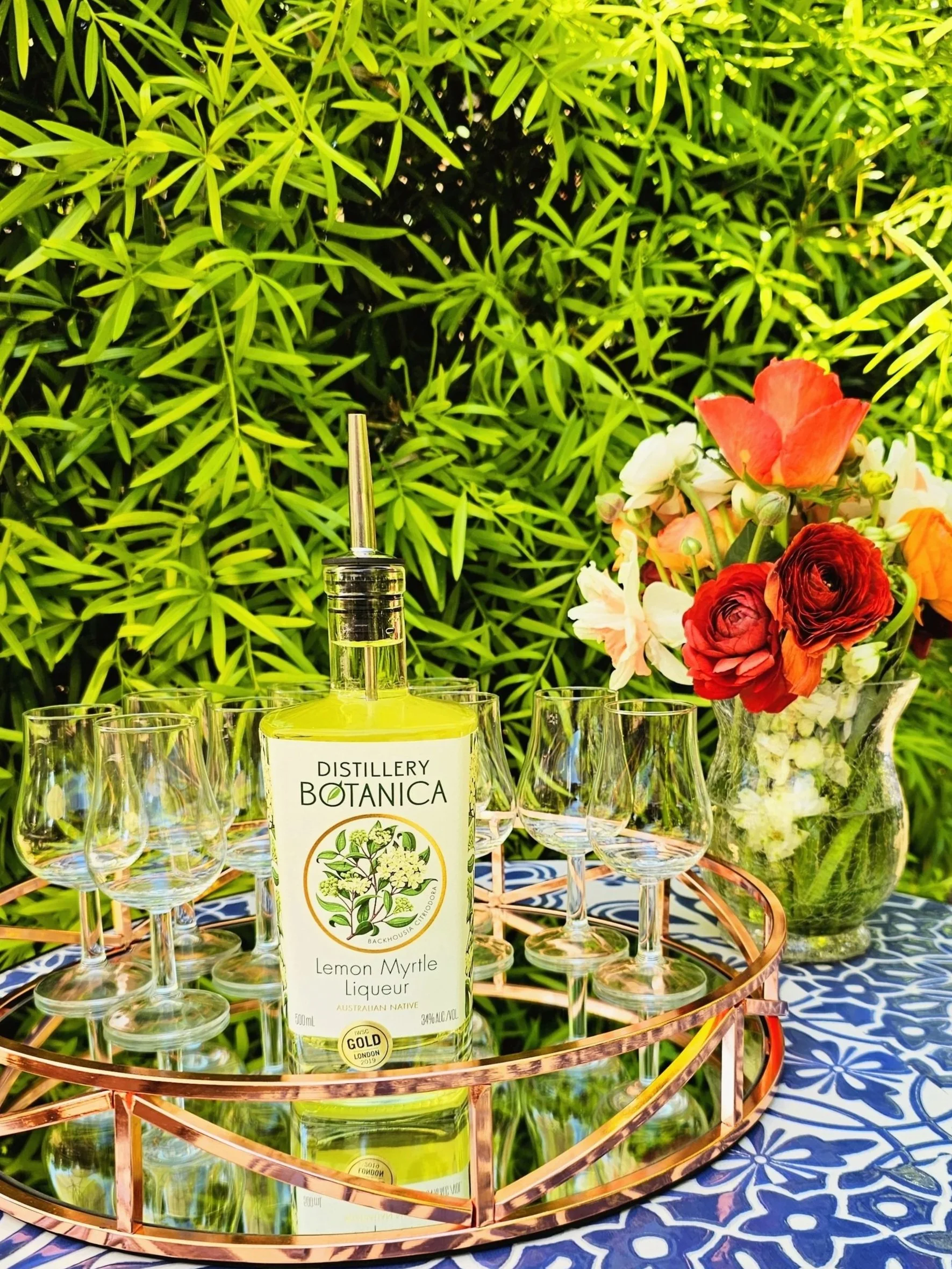 Distillery Botanica Lemon Myrtle Liqueur on a mirrored tray with tasting glasses in a garden setting.
