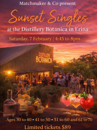 Hosted at the award-winning Distillery Botanica in Erina and presented by Matchmaker & Co, this intimate evening blends guided cocktail making, tastings and easy social rotation, grouped by age, to help connections unfold naturally, without pressure or awkward icebreakers.